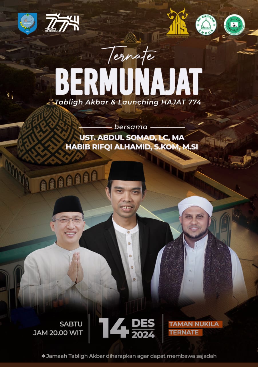 Ustad Abdul Somad (UAS) dan Habib Rifqi Alhamid direncanakan hadir pada acara yang dipusatkan di Taman Nukila, Ternate Tengah, Sabtu (14/12/2024), pukul 20:00 WIT, hari ini.