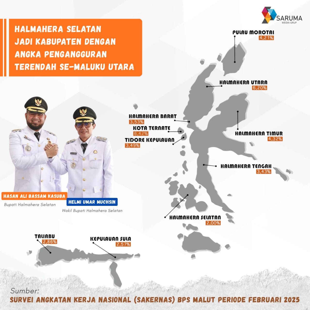 Dari rilis tersebut, Halsel tercatat sebagai daerah dengan tingkat pengangguran terendah di Maluku Utara yakni 2,00 persen.