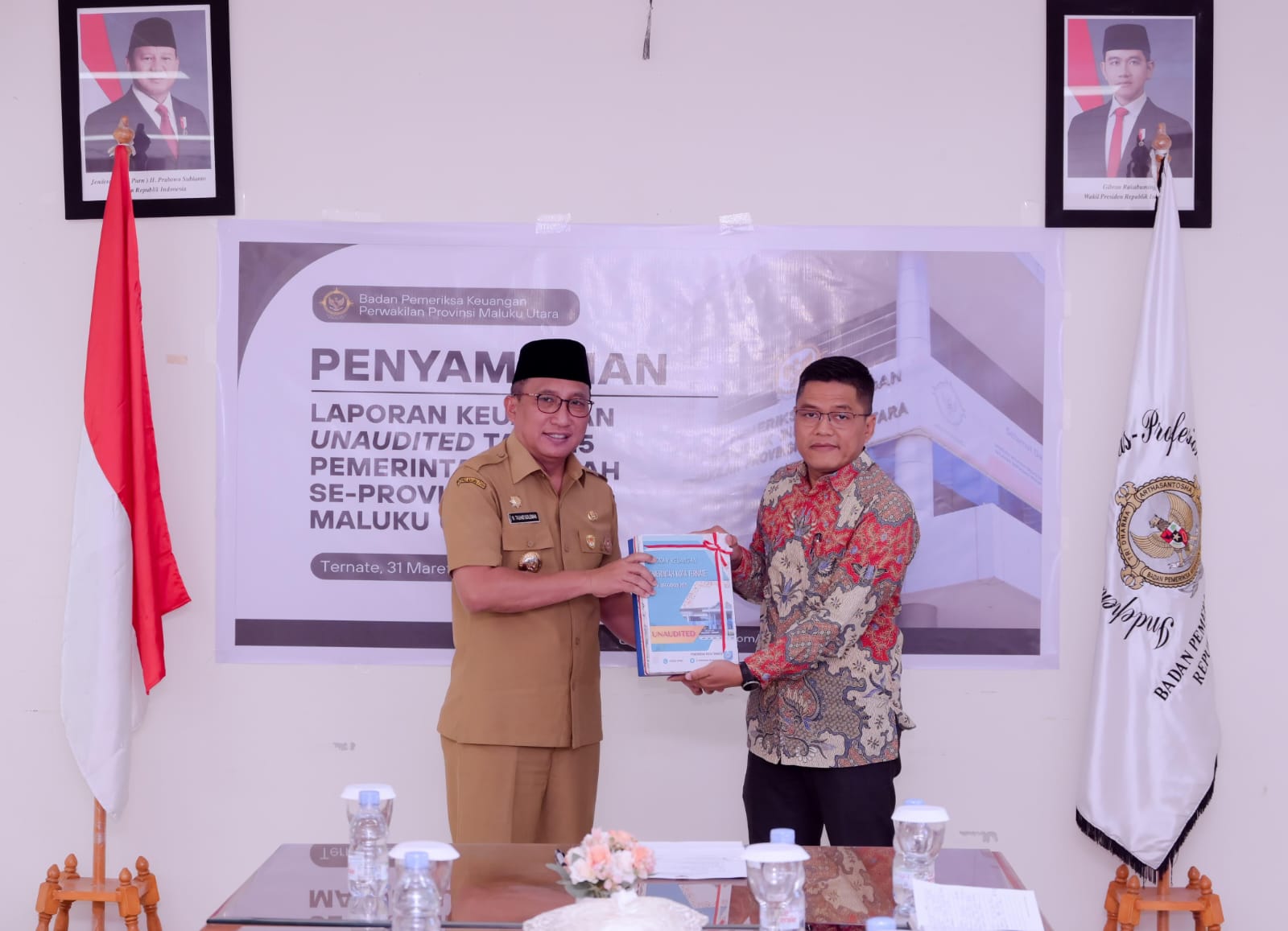LKPD diserahkan langsung oleh Wali Kota M Tauhid Soleman kepada Kepala Bidang Pemeriksaan Maluku Utara II, Kantor BPK Malut, Papang Arivianto, di gedung BPK RI Malut, Kota Ternate, Selasa 31 Maret 2026.