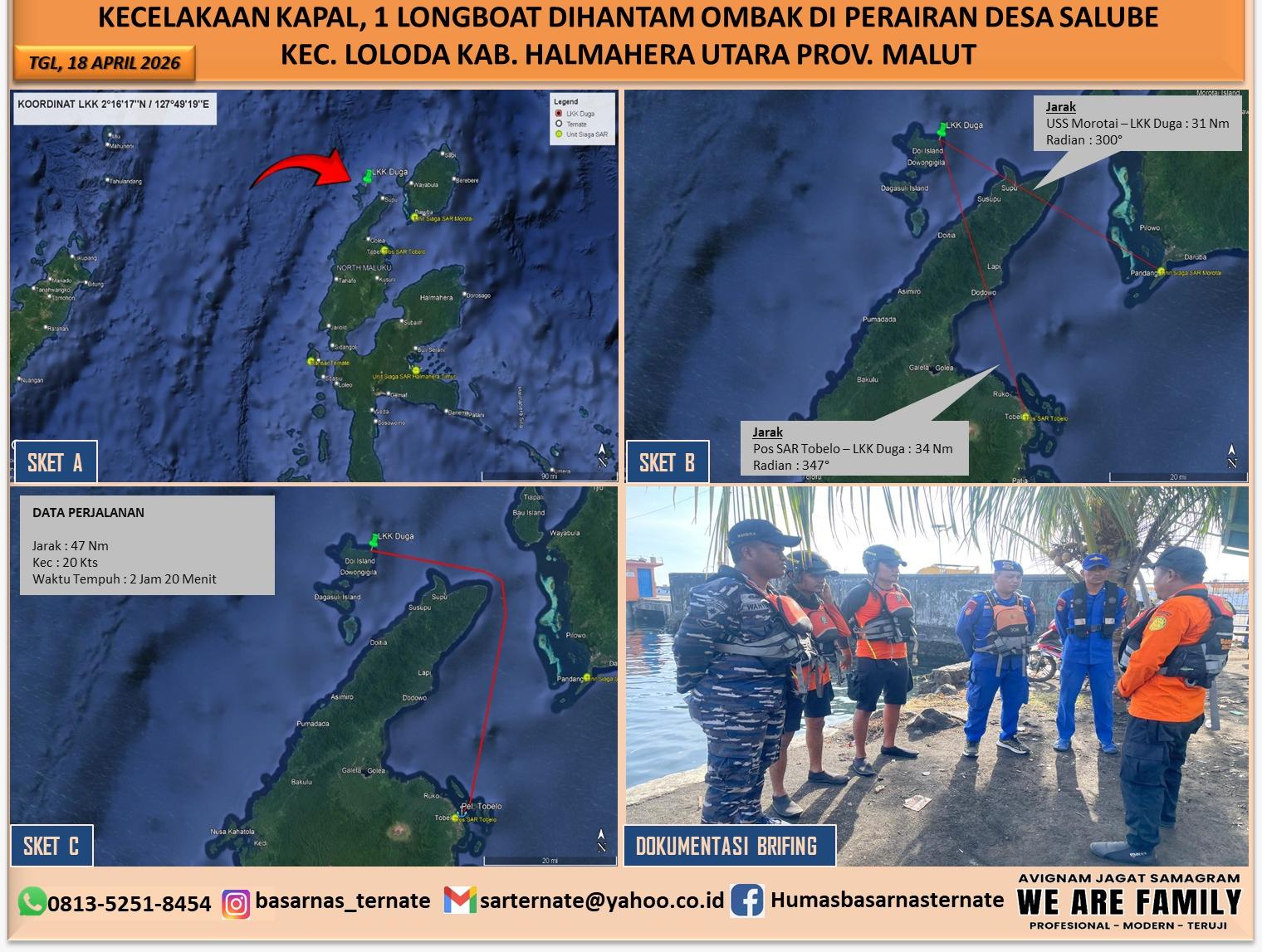 Sebuah longboat dengan jumlah person on boat (POB) 8 orang dilaporkan terbalik dan tenggelam di perairan Desa Salube tepatnya depan Selat Lebeno, Kabupaten Halmahera Utara, Provinsi Maluku Utara.